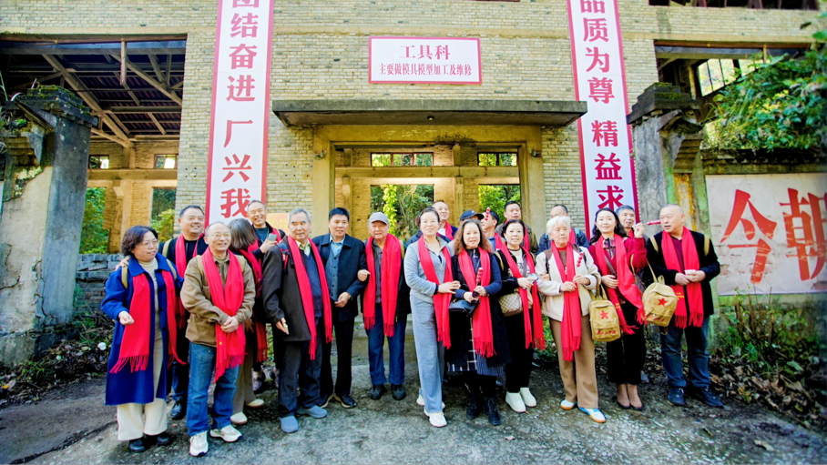 上午11时30分,老工人们抵达红山子弟校,参加“荣光归家路”迎宾仪式。由本地青少年组成的接亲队伍手持花束与稻穗,列队相迎,为每一位老工人佩戴荣誉围巾。仪式尾声,复原的“家门口”场景中,志愿者热情招呼:“老师傅们,欢迎回家,马上开席!”瞬间唤醒归家的温暖。