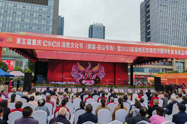 10月31日,第五届重庆“e乡e味”消费文化节(铜梁—巫山专场)暨成渝地区双城经济圈特色美食商品嗨购节在重庆市铜梁区龙城天街南广场开幕。本次活动以“赋能成渝双城经济圈建设·深化消费帮扶·乐享e乡e味”为主题,深度融合线上线下消费渠道,集中推广重庆本土及成渝地区特色美食与优质农产品,为市民打造一场融合味觉享受、视觉体验与购物乐趣的消费盛会。