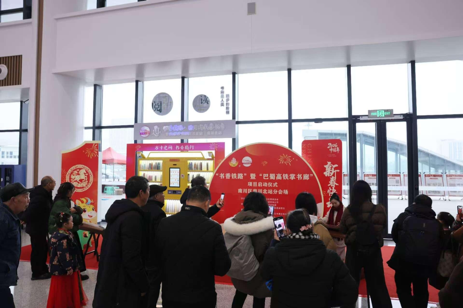 2月2日,“书香铁路·巴蜀高铁掌书廊”项目在重庆中心城区及各区县共17个高铁站点同步启幕,南川北站作为分会场,在候车厅顺利举办启动仪式。本次活动由重庆市文旅委、中国铁路成都局集团有限公司联合主办,南川区委宣传部、南川区文旅委共同承办,将候车厅巧妙打造成“旅途中的图书馆”,为过往市民旅客送上一场兼具文化味、书香气与年味儿的视听读写盛宴。