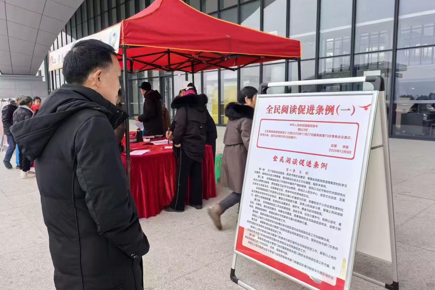 市民认真阅读全民阅读条例展板,推动阅读成为生活新风尚(南川区文旅委供图)