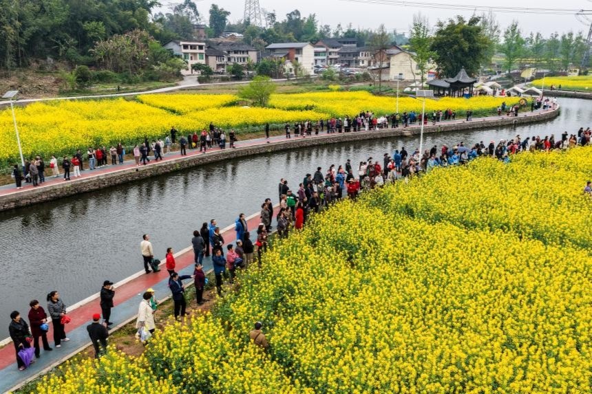央广网重庆4月8日消息(记者陈静)清明小长假及春假期间,重庆市长寿区新市街道纳溪河畔游人如织,花田火锅翻台不断,农家乐、民宿一座难求,“土家野鸡蛋”等农特产品销量翻番……短短数日,这片金色花海所在的乡村便实现消费收入约100万元。