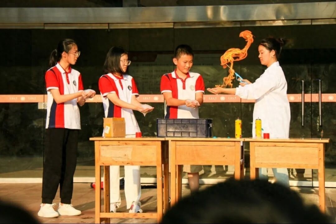 科技节活动覆盖全学段、全学科,亮点纷呈。化学组“火焰掌”“魔幻火山喷发”等实验将抽象原理转化为视觉奇观;物理游园设置“特斯拉线圈”“静电跳球”互动装置,让学生亲验课本知识;生物显微镜观察与地理课程基地的气象站、AI模型演示,结合天文社月球观测活动,激发学生对自然与宇宙的探索兴趣。