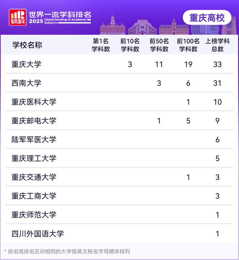 重庆大学有33个学科上榜,其中3个学科位于前十名;西南大学有31个学科上榜,领跑全市。重庆上榜高校还有重庆医科大学(10个)、重庆邮电大学(9个)、陆军军医大学(6个)、重庆理工大学(5个)、重庆交通大学(3个)、重庆工商大学(3个)、重庆师范大学(1个)、四川外国语大学(1个)。