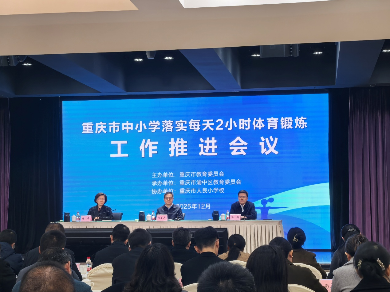 12月25日,重庆市中小学落实每天2小时体育锻炼工作推进会在人民小学召开。会议分享了南川区教委、人民小学、璧山区东林初级中学在落实每天2小时体育锻炼方面的制度成果和创新举措。市委教育工委书记、市教委主任刘宴兵出席会议并讲话,渝中区人民政府副区长陈平致辞,市委教育工委委员、市教委副主任江鹏主持会议。