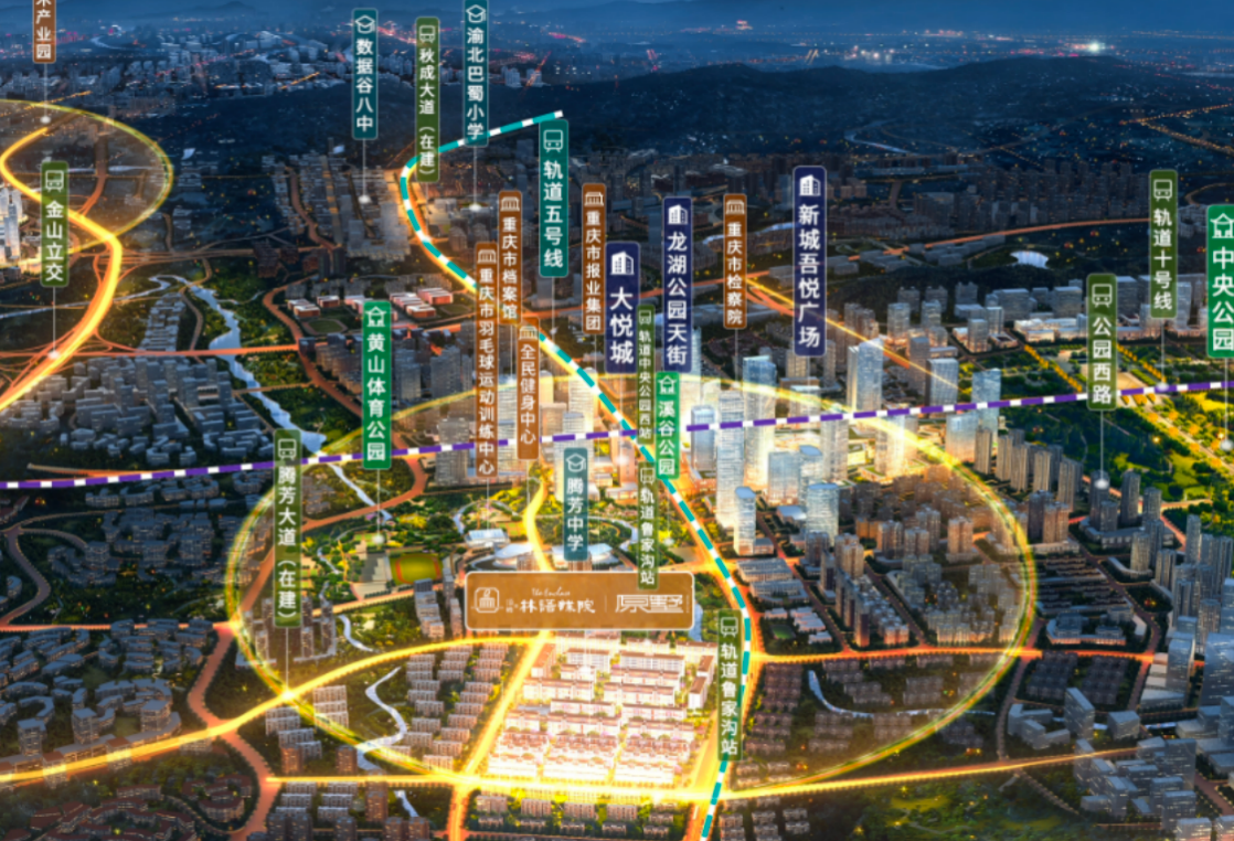 真正的稀缺,根植于不可复制的地段。从规划图可以看到,项目雄踞重庆两江新区中央公园板块核心,坐拥“双核”资源:直线距离约900米即到亚洲第一的城市级绿肺重庆中央公园,占地约2300亩的重庆中央公园。不仅是城市的生态绿肺,更是市民休闲、运动、文化活动的目的地。约800米即达总体量约600万方的两江国际商务中心,汇聚了龙湖天街、中粮大悦城、新城吾悦广场等五大顶级购物中心,构筑成中国西部旗舰级商圈。这种“公园+商圈”的双重拥抱,重新定义“十分钟国际生活圈”的黄金标准。