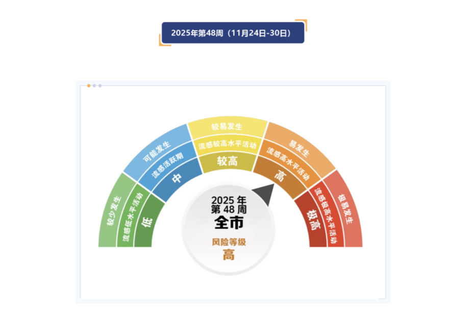 11月20日,中国疾病预防控制中心发布的《流感监测周报(第46周)》显示,11月10日至16日,南、北方省份流感活动都在上升,全国共报告955起流感样病例。11月25日,重庆疾控发布第48周(11月24日-30日)“流感风险等级”,表示重庆全市流感风险等级为高,流感活动水平为高水平活动,发病水平显著升高,处于流感流行高峰期,