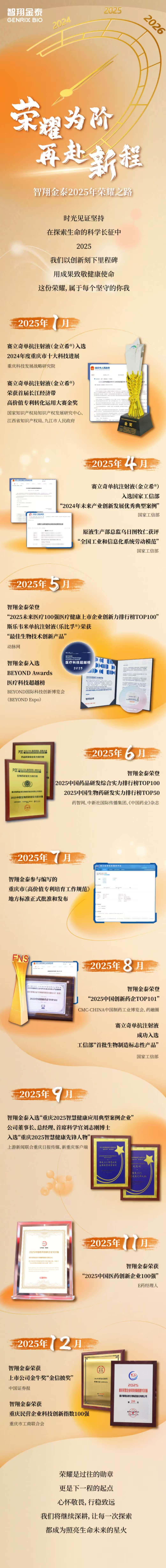 在生物医药创新的前沿征程中,智翔金泰始终以科技为笔,以坚持为墨,书写着中国自主创新的坚定足迹。从突破性的单抗药物研发,到入选国家级产业案例;从参与制定地方标准,到屡获行业顶级荣誉——每一步攀登,都是对创新坚守的生动诠释。2025年,智翔金泰凭借扎实的研发实力与持续的创新动能,接连斩获多项权威认可,展现了重庆乃至中国生物医药产业的蓬勃力量与无限前景。荣誉,是见证,更是起点。未来,智翔金泰将继续深耕研发创新,助力健康中国。(来源:重庆智翔金泰)