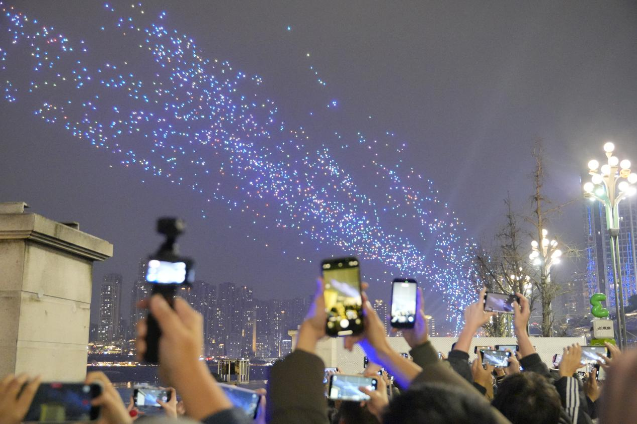 当晚11点过,江面上,三艘水秀表演船喷射出巨型激光水幕,光束穿透水雾与空中的无人机阵列上下呼应,织就一幅幅跨越江面的立体画卷;陆地上,创新联动技术让空中无人机编队仿佛化身“光影开关”,实时“触发”沿江楼宇的景观灯光随之律动变化;夜空中,8000架无人机腾空而起、列阵长空,组成双编队不断变换阵型,与两岸错落有致的璀璨夜景交相辉映。