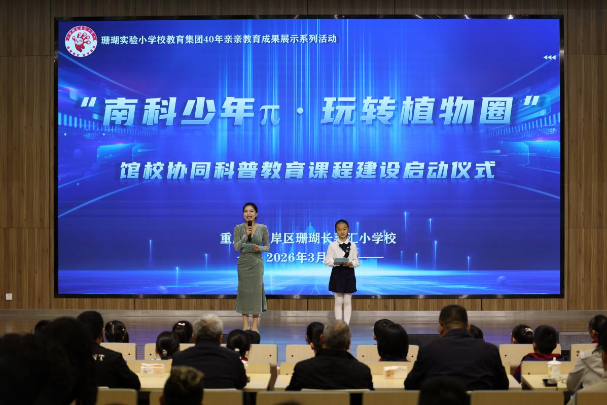 3月31日,重庆市南岸区“南科少年π·玩转植物圈”馆校协同科普教育课程在珊瑚长嘉汇小学正式启动。据悉,该项目是南岸区科协聚焦青少年科学素养培育,以视觉化、场景化、沉浸式为核心打造的科普教育示范品牌,通过整合重庆市中药研究院、南山植物园等优质科普资源,将植物科学、生态探究、中药文化转化为可看、可学、可动手、可体验的可视化科普内容,以实景呈现、互动实践、数字赋能助力“双减”落地,全面培育青少年科学精神与综合素养。