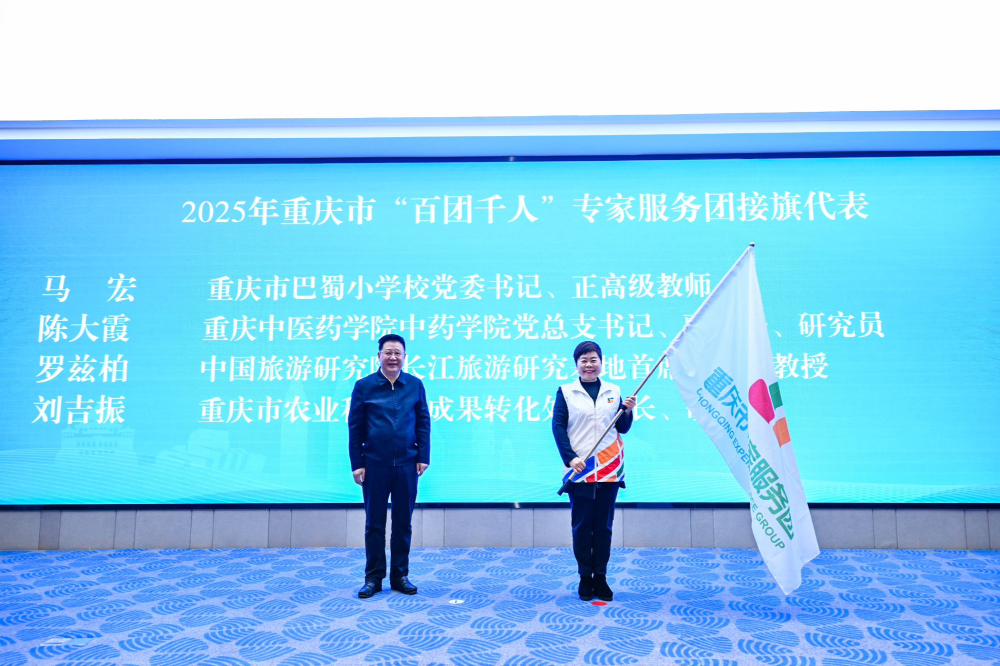 会议现场举行了2025年重庆市“百团千人”专家服务团出征授旗仪式,今年将选派126个专家团队、1041名专家为126个受援单位提供有力技术支持和咨询服务。