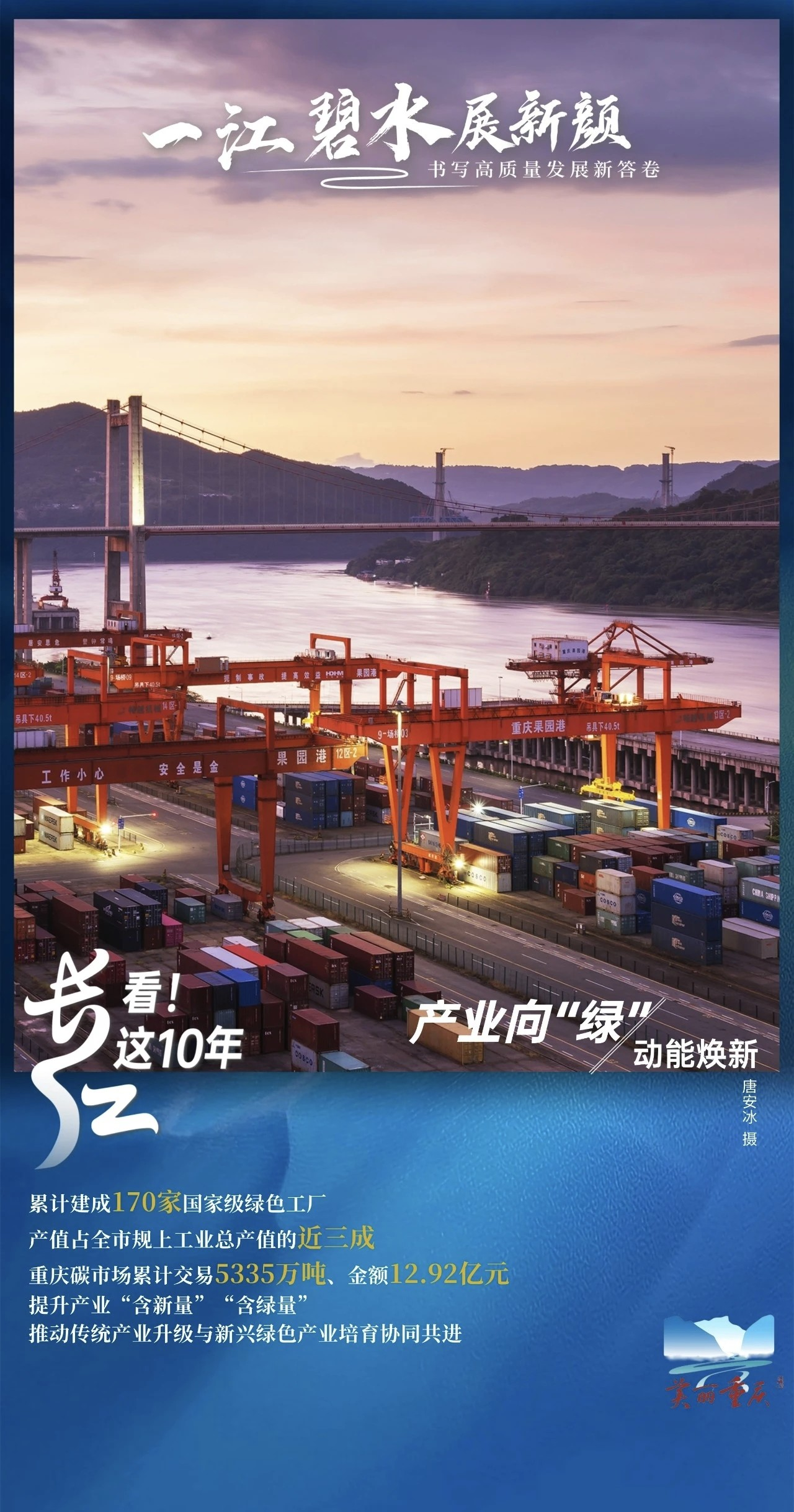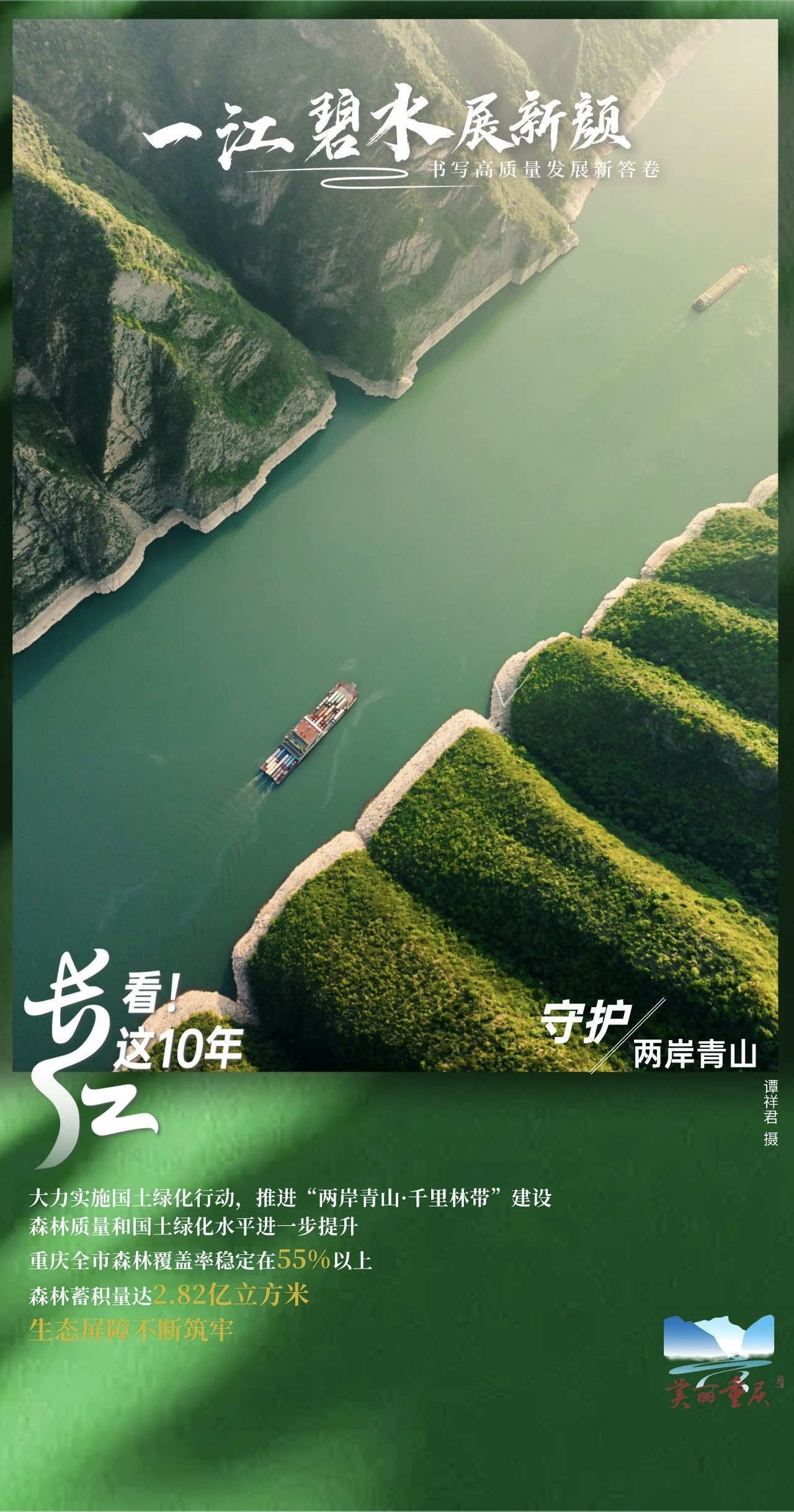 大江浩荡,奔涌新时代青山巍巍,见证新作为。2016年1月5日,重庆推动长江经济带发展座谈会召开。作为长江上游生态屏障的“最后一道关口”,重庆坚决扛起“上游责任”,以十年如一日的笃行实干,不断提升发展的“含绿量”生态的“含金量”。