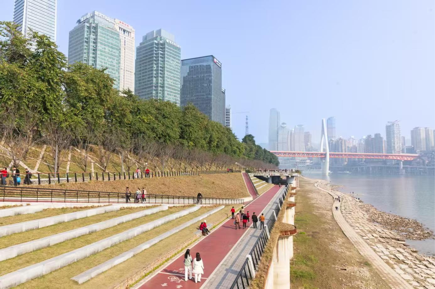 两江新区江滩公园市民悠闲散步(重庆市生态环境局供图)