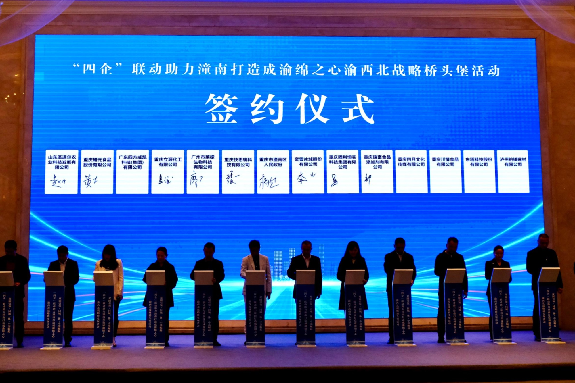 中国联通重庆分公司、中国铁塔重庆分公司、中国物资再生协会、重庆市农投集团、京东方艺云(成都)科技有限公司、蜜雪冰城股份有限公司、新加坡新材料私人有限公司等26家企业代表分别与潼南区政府进行现场签约,金额27.1亿元。