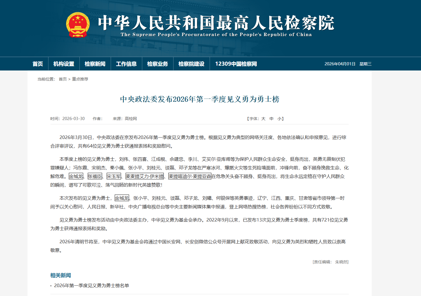 3月30日,中央政法委发布2026年第一季度见义勇为勇士榜,全国64人上榜,重庆2名平民英雄榜上有名。
