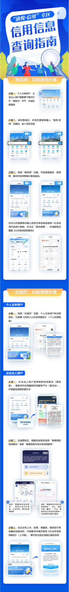信用主体可通过手机应用市场下载“渝快办”APP,完成实名注册登录后,在首页搜索框输入“渝悦·信用”关键词,按提示打开相应页面,查询对应主体的股权、高管、行政处罚等信息,或查看完整版《公共信用信息报告》。企业法人可查询《企业专项信用报告》(上市版),个人可查看《自然人公共信用报告》(个人所得税版)。