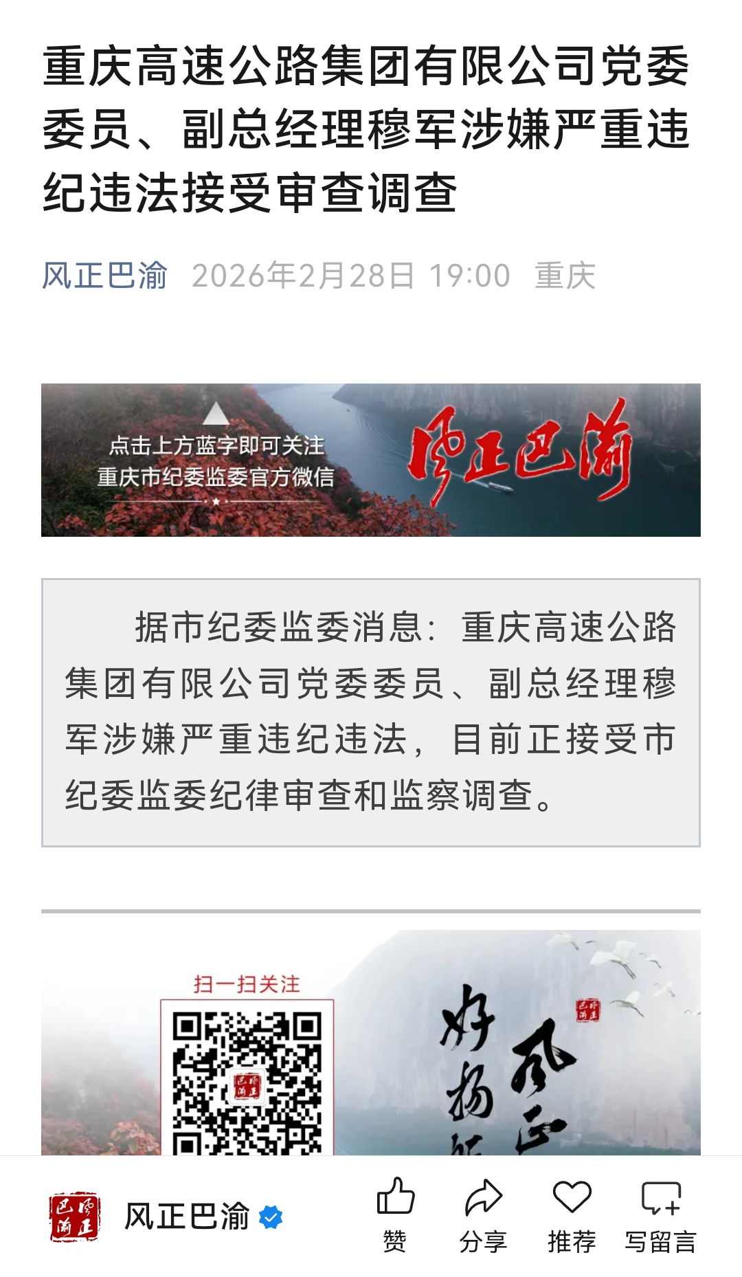 央广网重庆2月29日消息(记者王海)2月28日,据重庆市纪委监委消息,重庆高速公路集团有限公司党委委员、副总经理穆军涉嫌严重违纪违法,目前正接受市纪委监委纪律审查和监察调查。