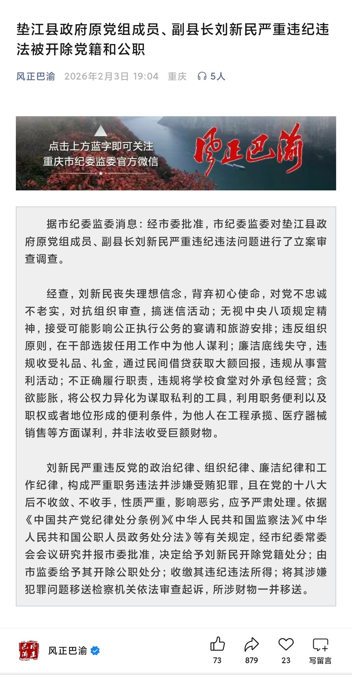 央广网重庆2月3日消息(记者王海)2月3日,据市纪委监委消息:经市委批准,市纪委监委对垫江县政府原党组成员、副县长刘新民严重违纪违法问题进行了立案审查调查。