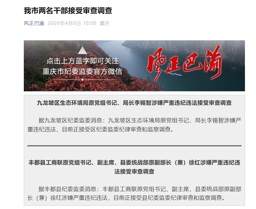 央广网重庆4月8日消息(记者王海)4月8日,据重庆市纪委监委消息,重庆两名干部接受审查调查,九龙坡区生态环境局原党组书记、局长李锡智涉嫌严重违纪违法接受审查调查;丰都县工商联原党组书记、副主席,县委统战部原副部长(兼)徐红涉嫌严重违纪违法接受审查调查。